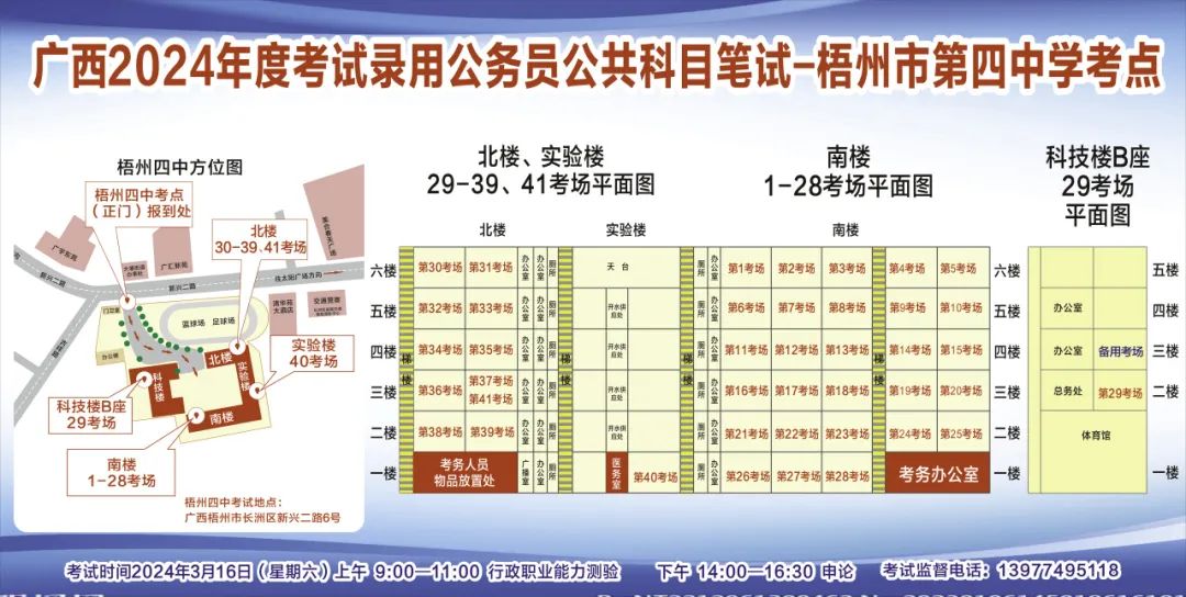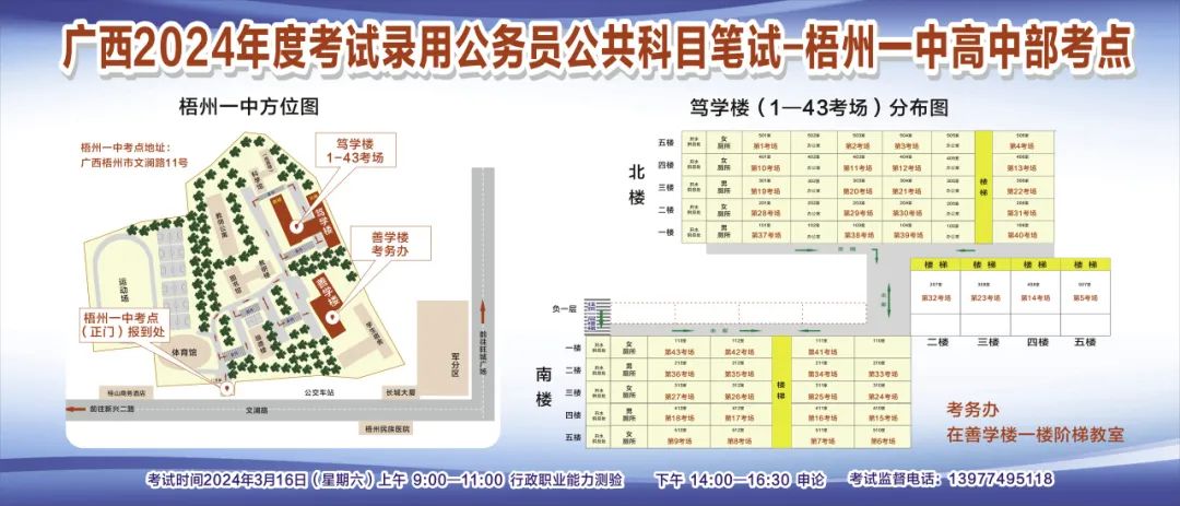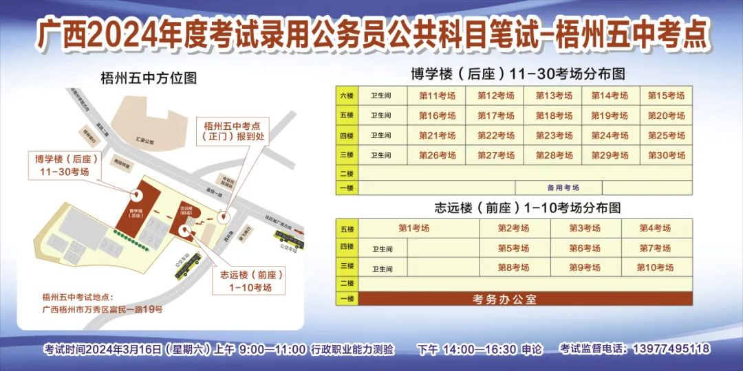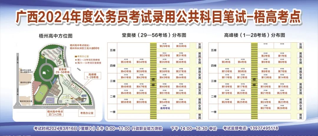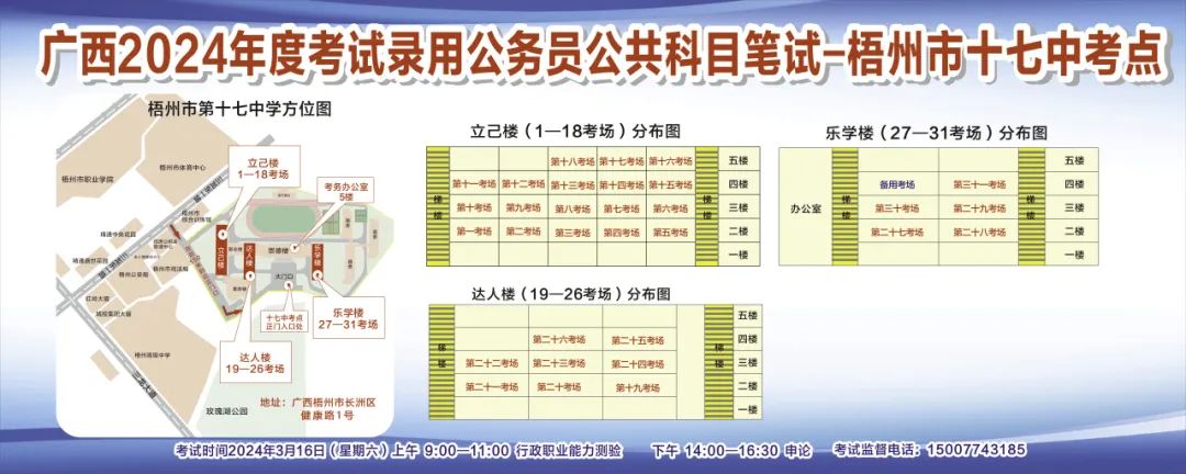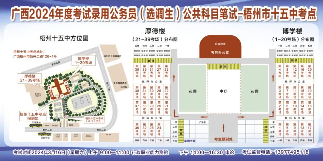 一、廣西2024年度考試錄用公務(wù)員(選調(diào)生)公共科目筆試將于3月16日舉行,梧州考區(qū)共設(shè)置9個考點(diǎn),請考生提前熟悉各自考點(diǎn)位置、周邊環(huán)境及交通情況,考試當(dāng)天提前出門做好準(zhǔn)備,準(zhǔn)時參加考試。特別提示:因考點(diǎn)停車場地有限,所有考生車輛不得進(jìn)入考點(diǎn),請考生規(guī)劃好前往考點(diǎn)的交通方式和路線。