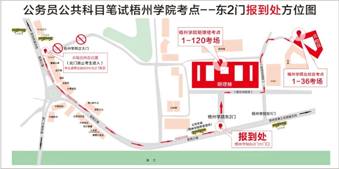 公交車參考:乘坐10路、32路、49路、49路延長線、蒼梧城鄉(xiāng)6路到梧州學(xué)院體育館站,下車后步行約200米到達(dá)梧州學(xué)院東大門。考生統(tǒng)一在梧州學(xué)院東大門進(jìn)入,考點(diǎn)門口處于交通干道,送考車輛只能在東門外短暫停留,梧州學(xué)院南門及其他門無法核驗(yàn)考生身份。從東大門進(jìn)入明理教學(xué)樓考點(diǎn)考場步行約5分鐘,進(jìn)入北校區(qū)教學(xué)樓考點(diǎn)考場步行約15分鐘,請規(guī)劃好進(jìn)入考點(diǎn)時間。