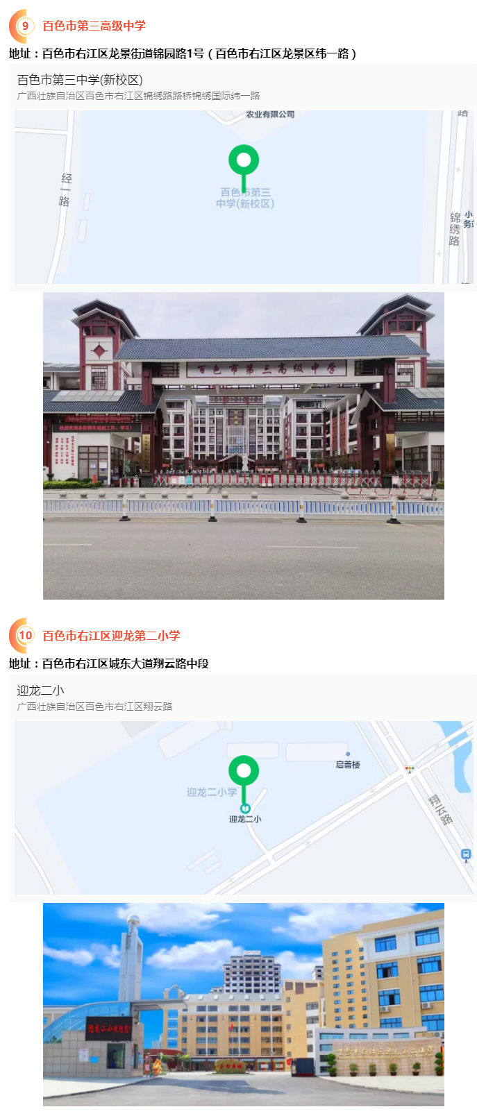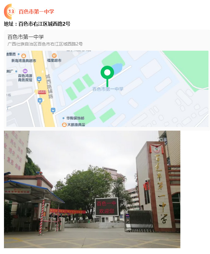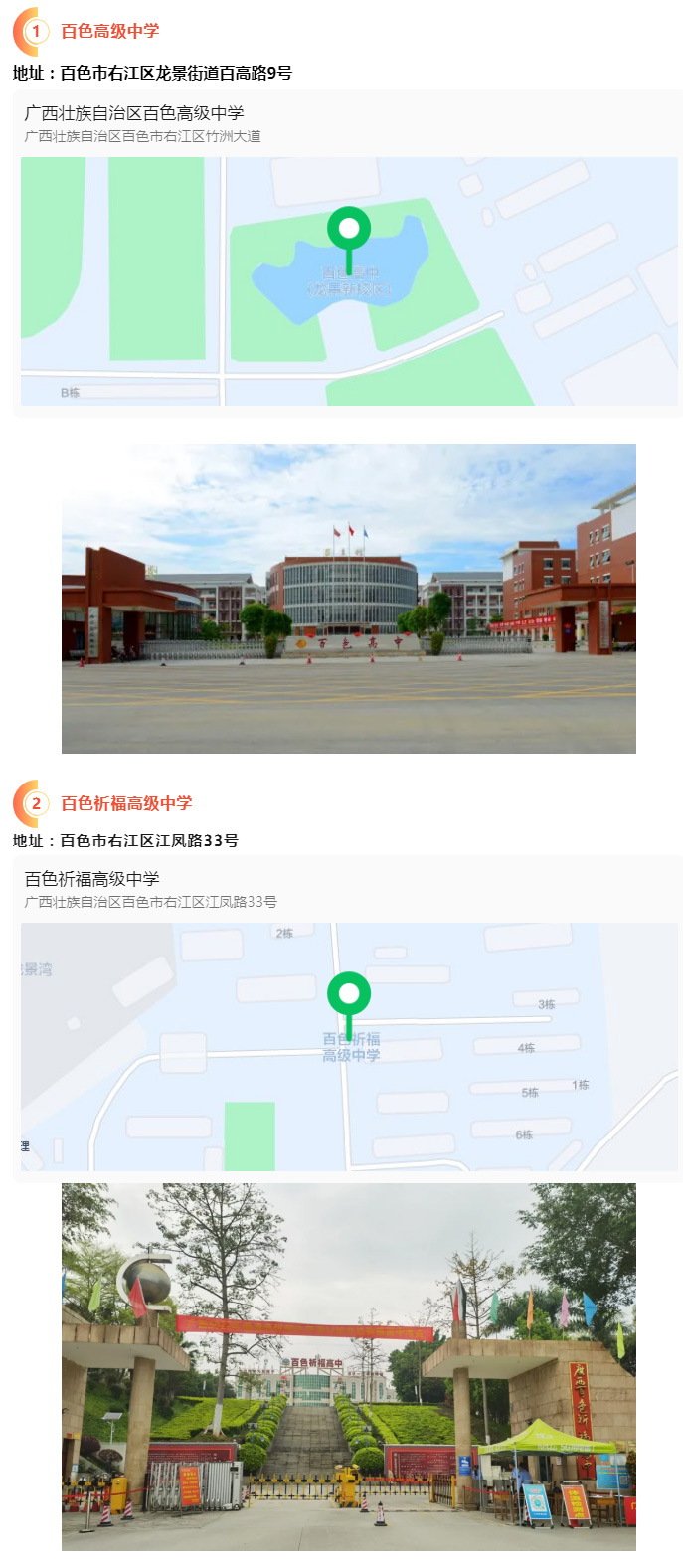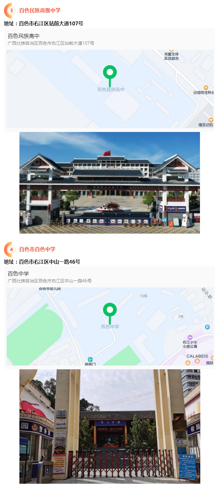 2.請?zhí)崆笆煜た键c地址,做好路線、住宿的安排。本次考試參考人數(shù)較多,考點分布分散,建議考生考前實地察看考點,確認考點入口位置,防止走錯考點。請充分考慮考點周邊交通通行情況和停車場地容量,合理安排出行方式,預留充足時間,確??荚嚠斕彀磿r到達。另外,考試期間百色市及各考點學校周邊的住宿比較緊張,請?zhí)崆邦A定。