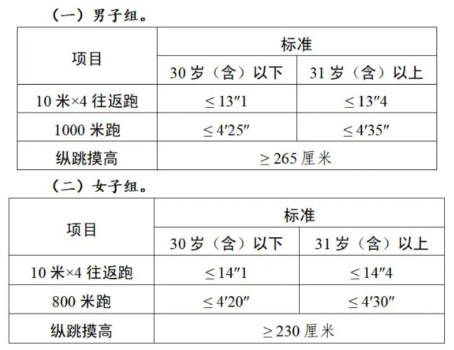根據(jù)中共中央組織部辦公廳、公安部辦公廳印發(fā)的《公安機(jī)關(guān)錄用人民警察體能測(cè)評(píng)項(xiàng)目和標(biāo)準(zhǔn)》(公政治〔2024〕60號(hào))文件精神,體能測(cè)評(píng)的項(xiàng)目和標(biāo)準(zhǔn)如下: