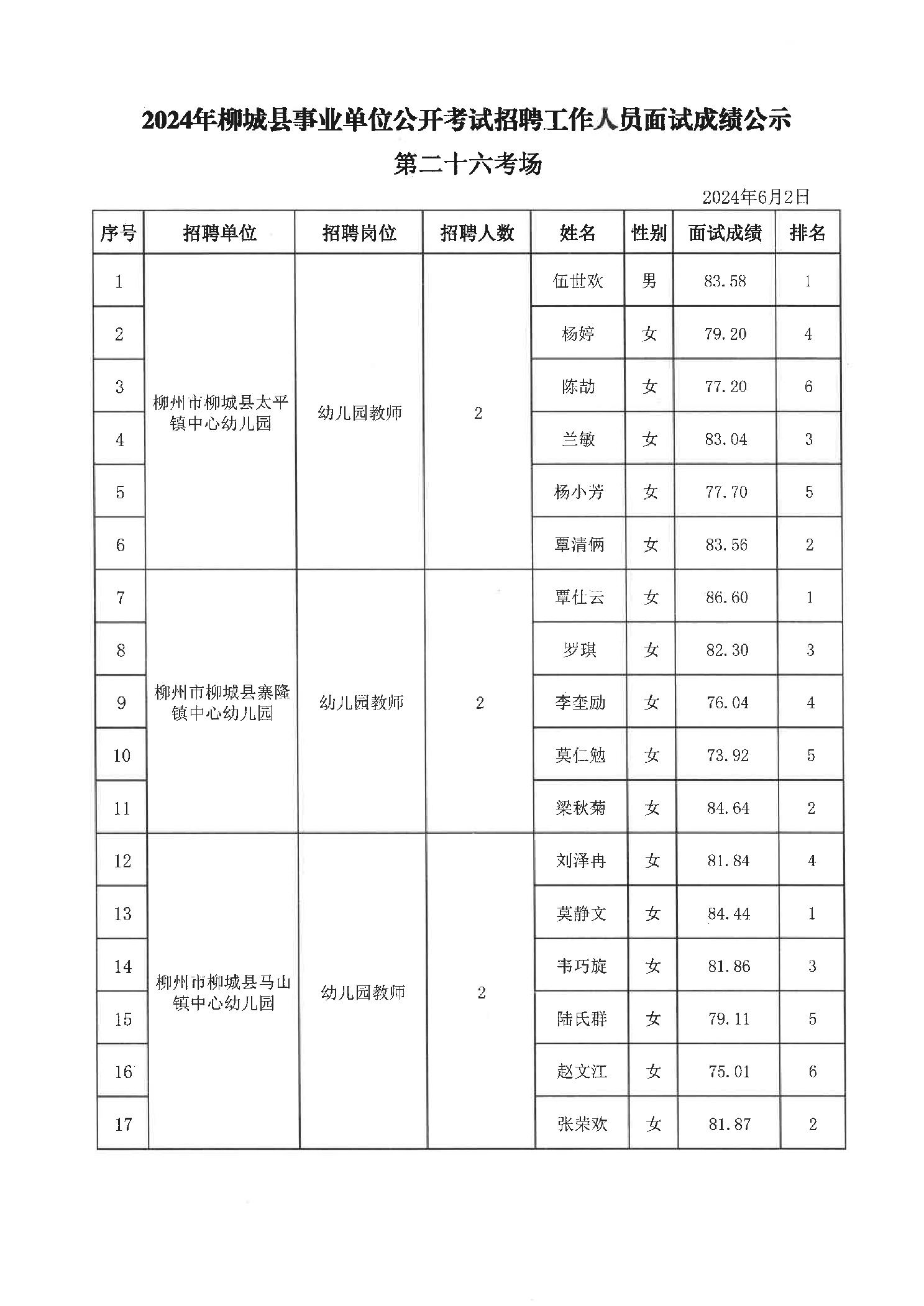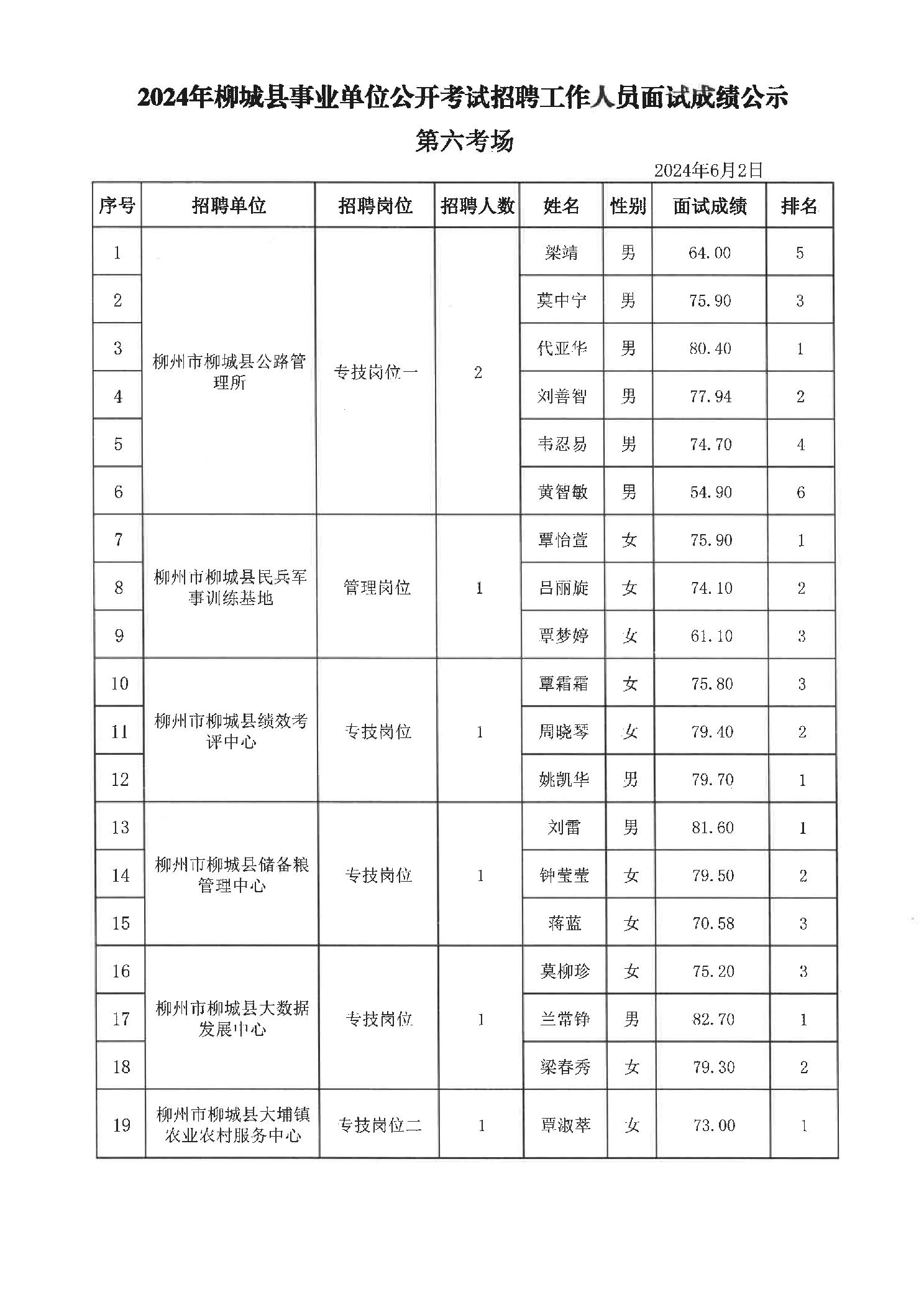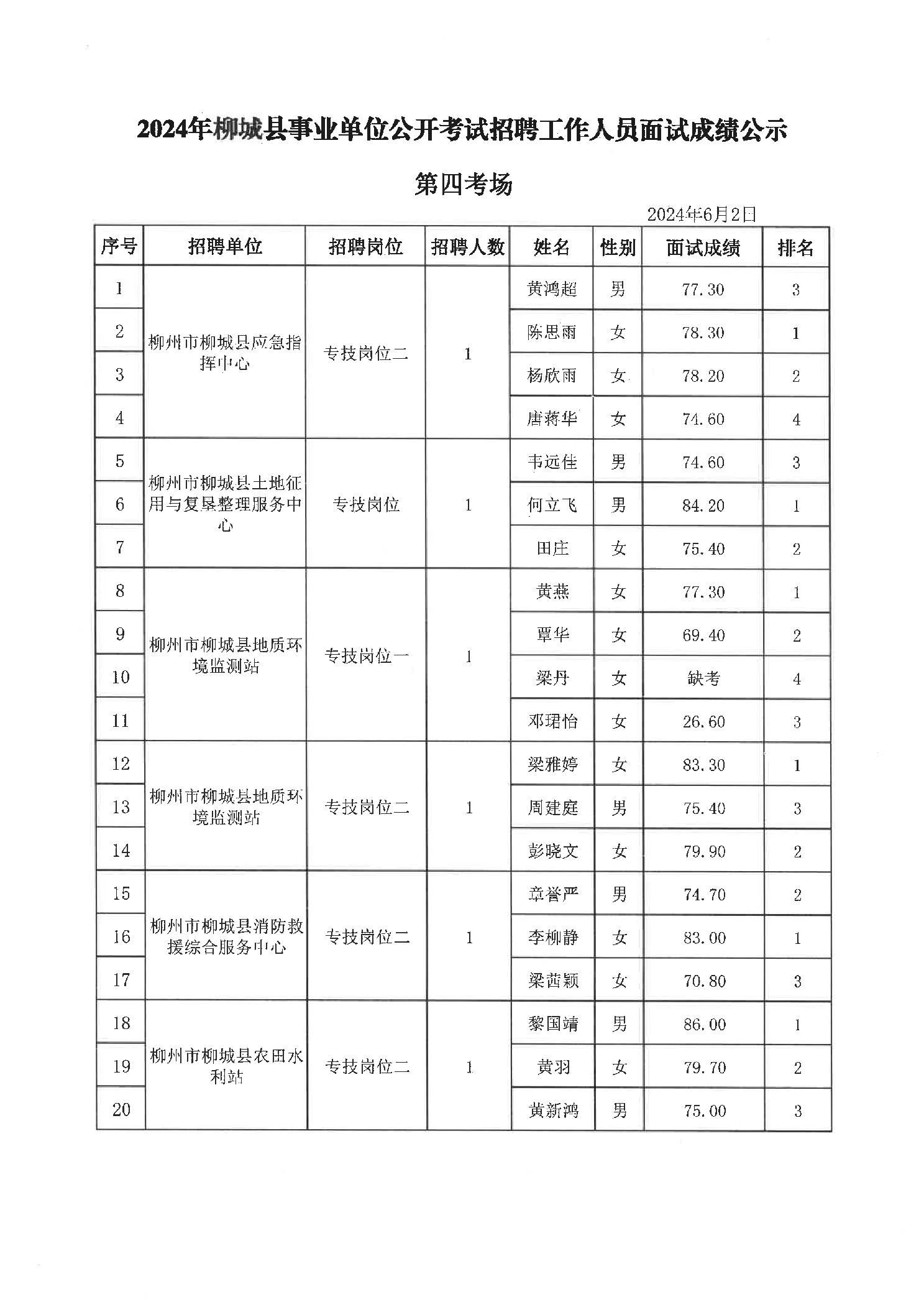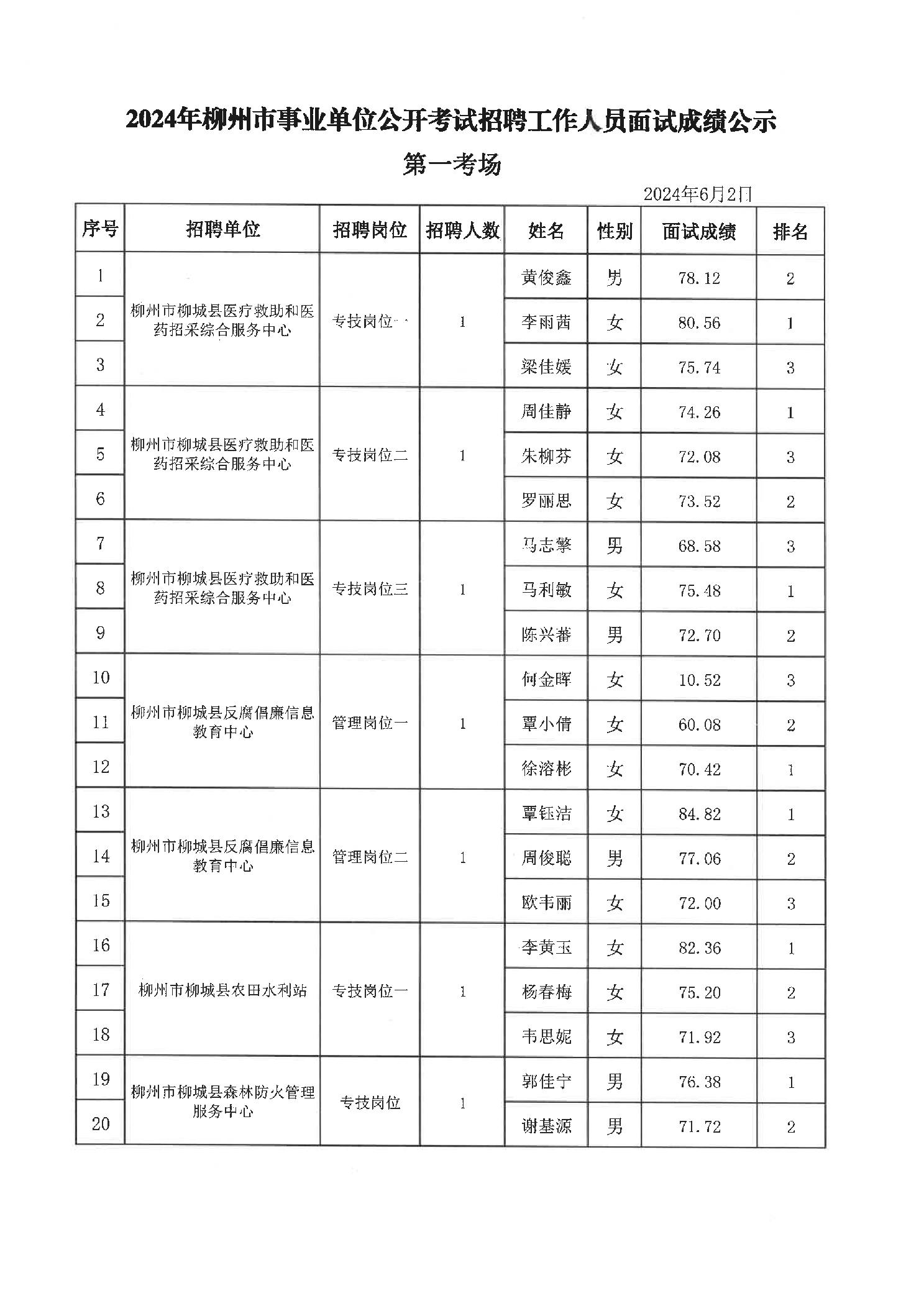 2024年柳城縣事業(yè)單位公開考試招聘工作人員面試成績公示