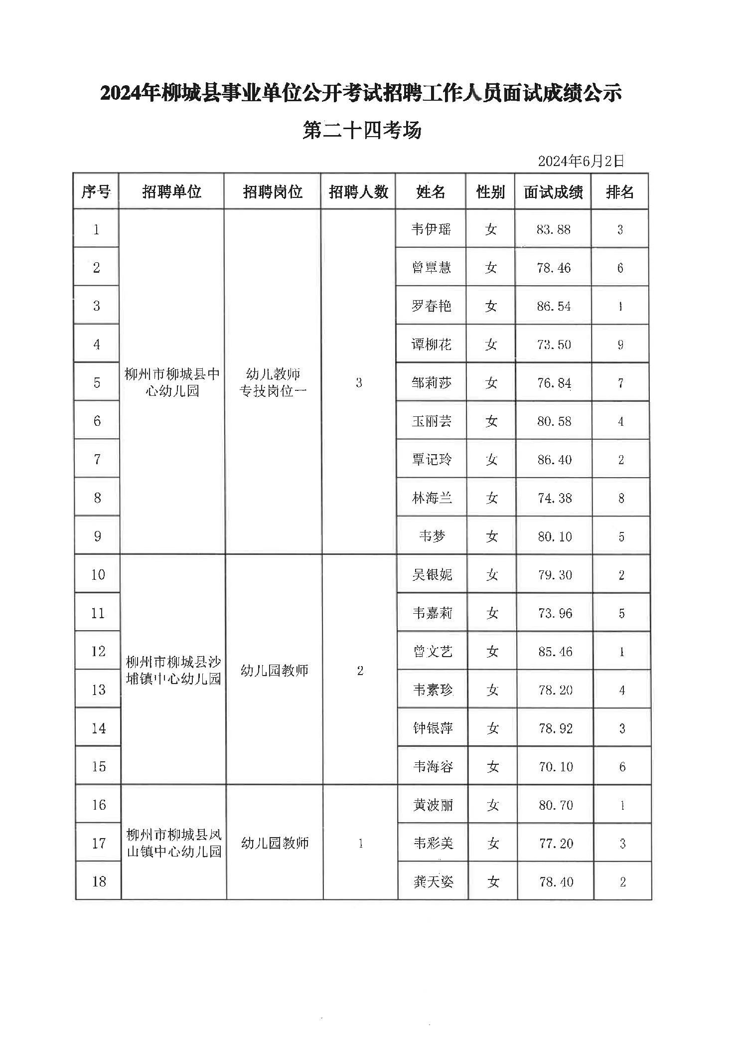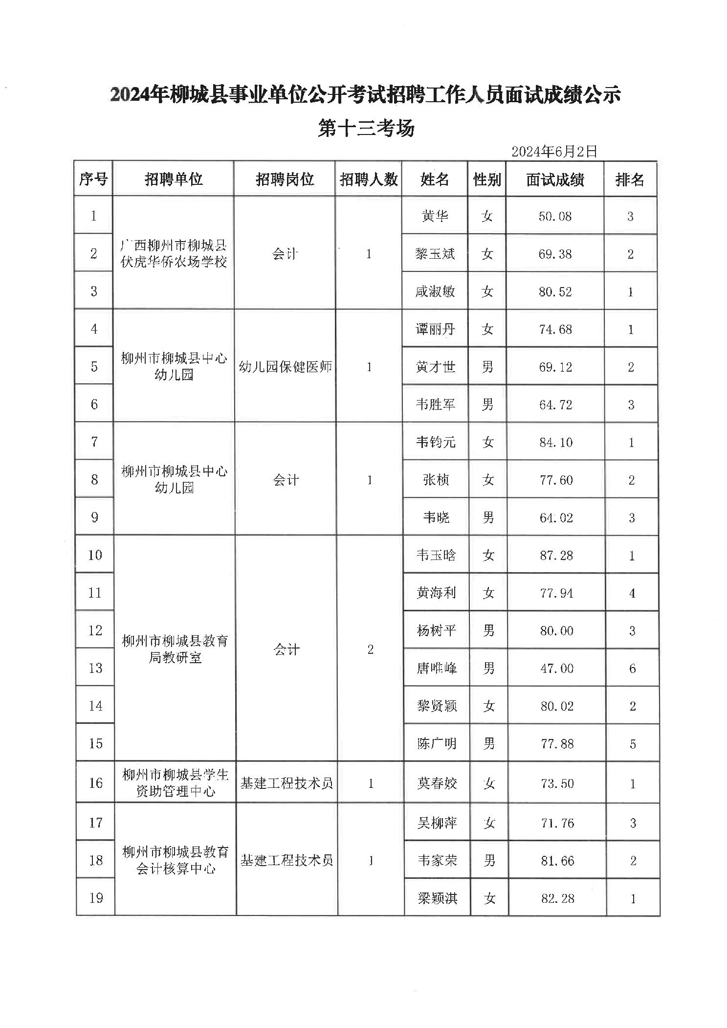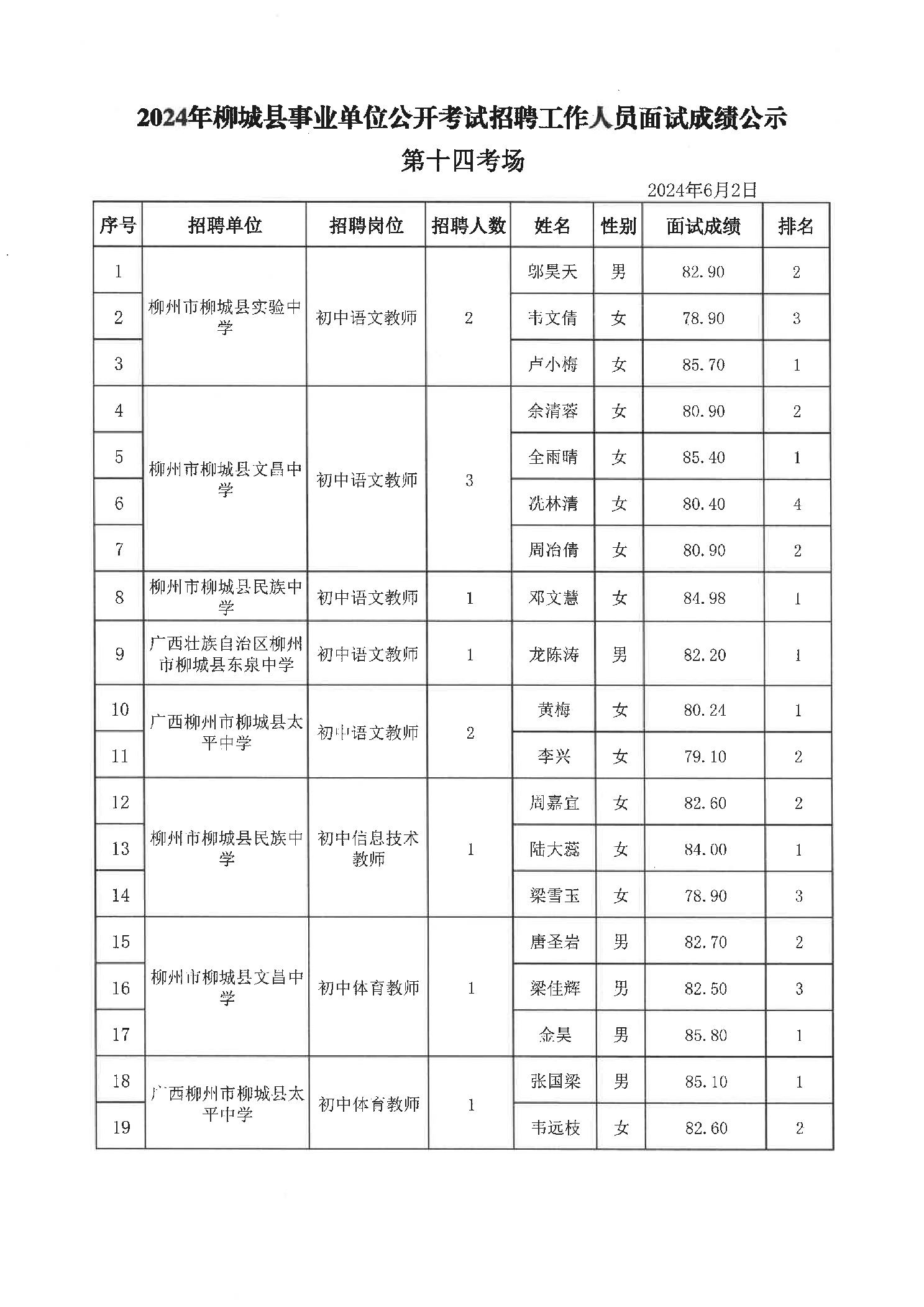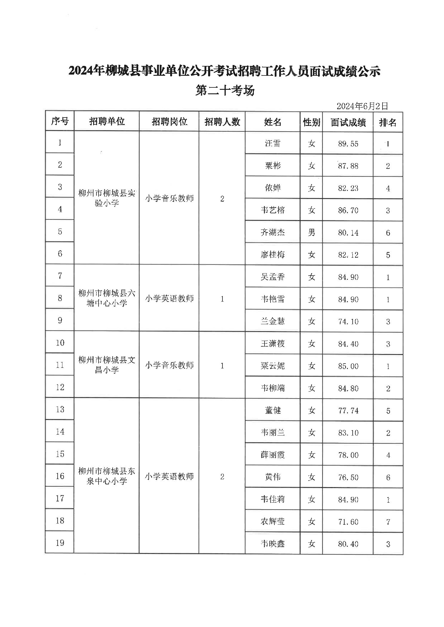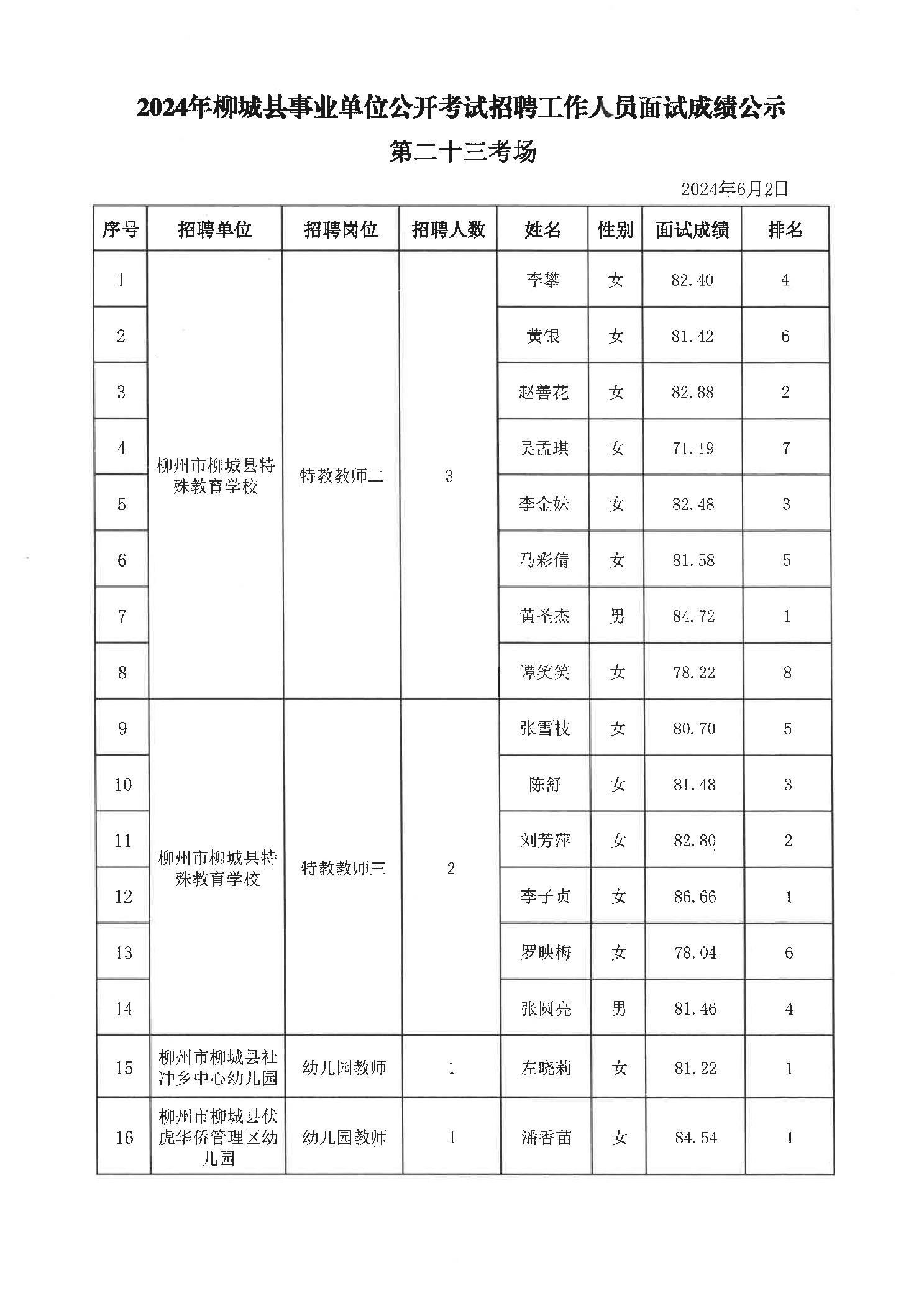 2024年柳城縣事業(yè)單位公開考試招聘工作人員面試成績公示