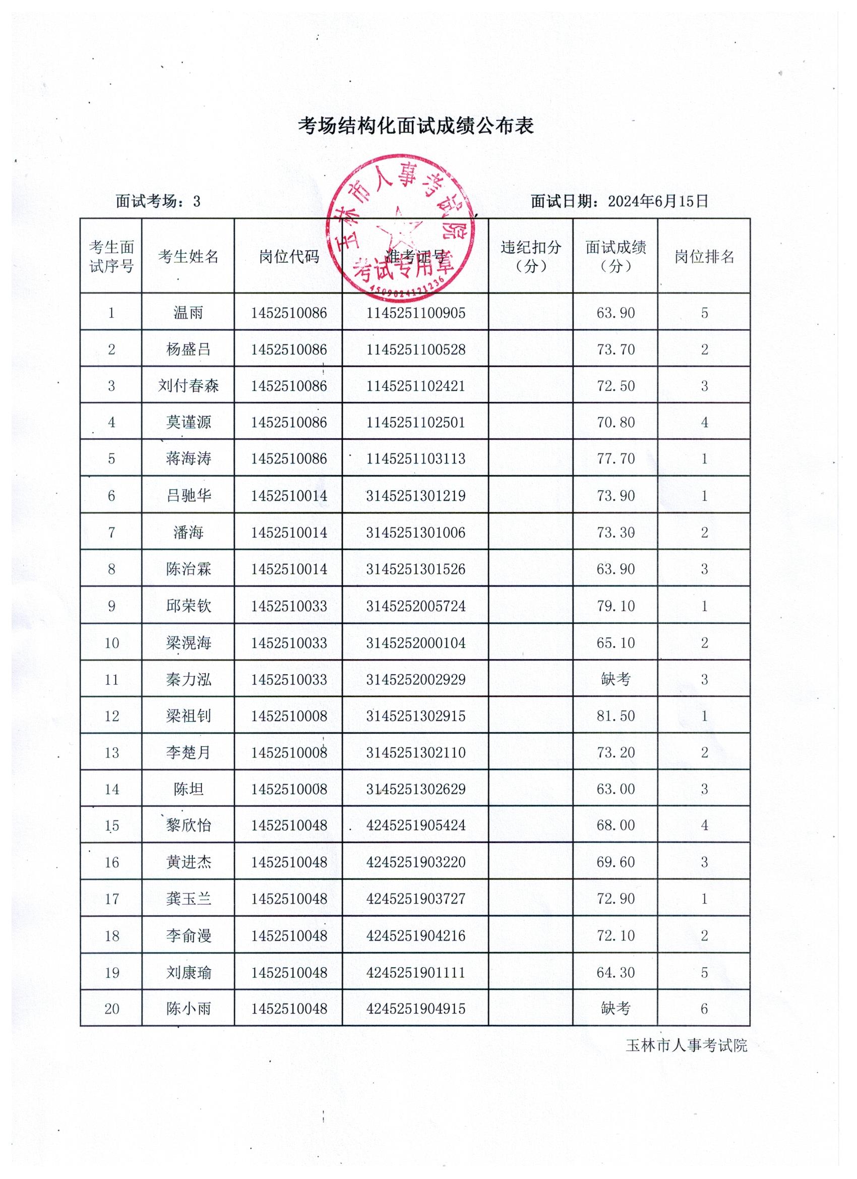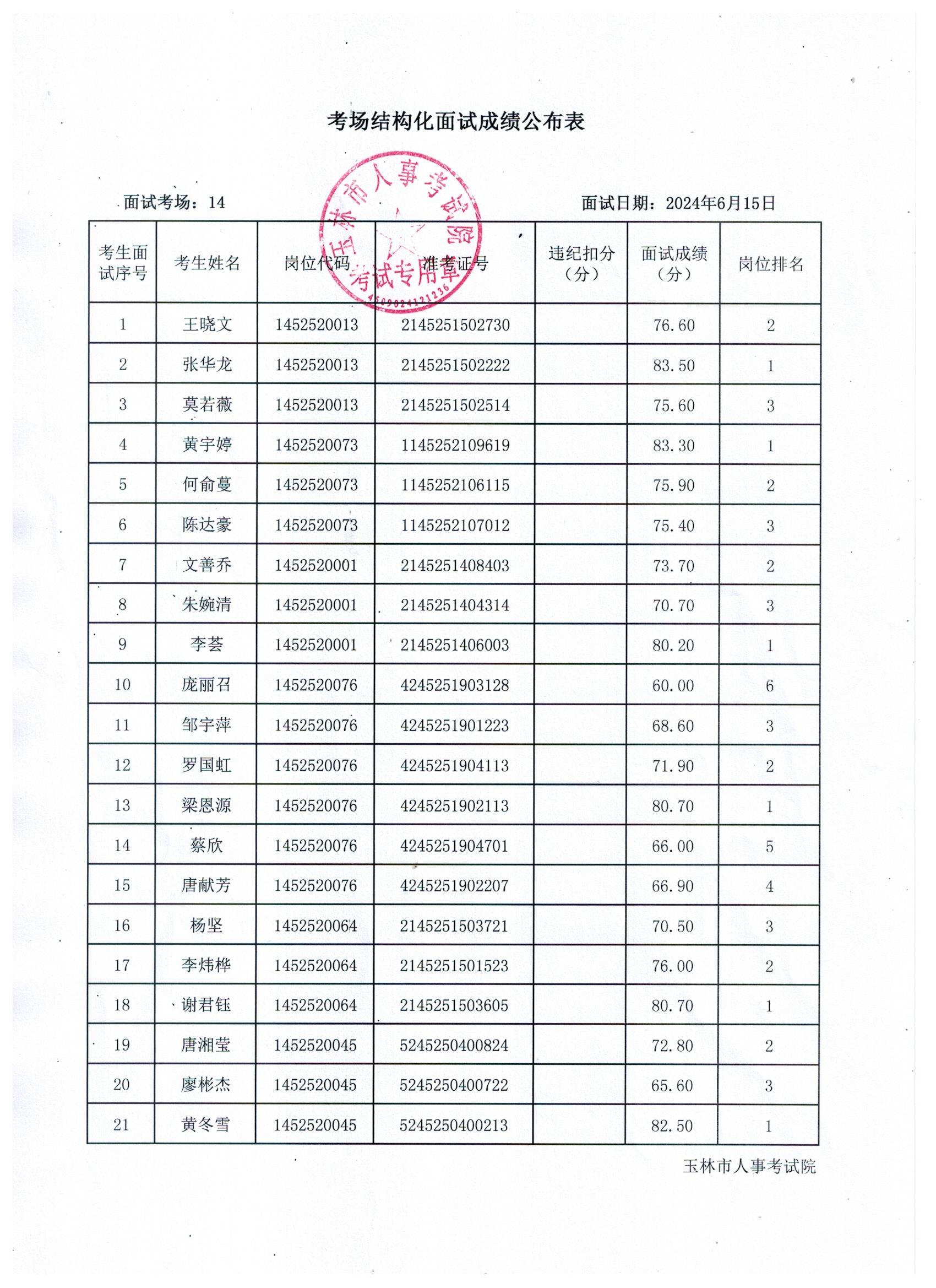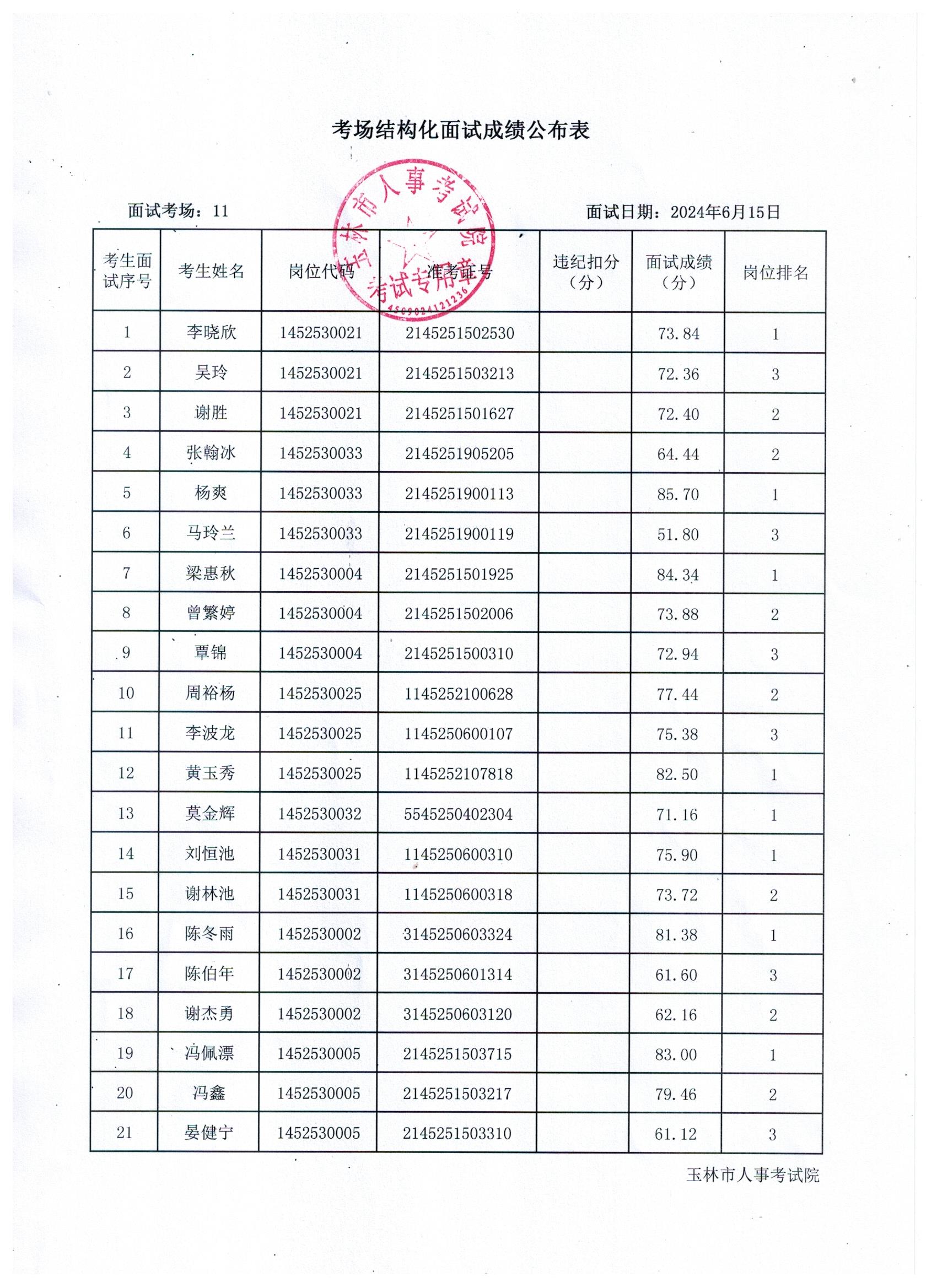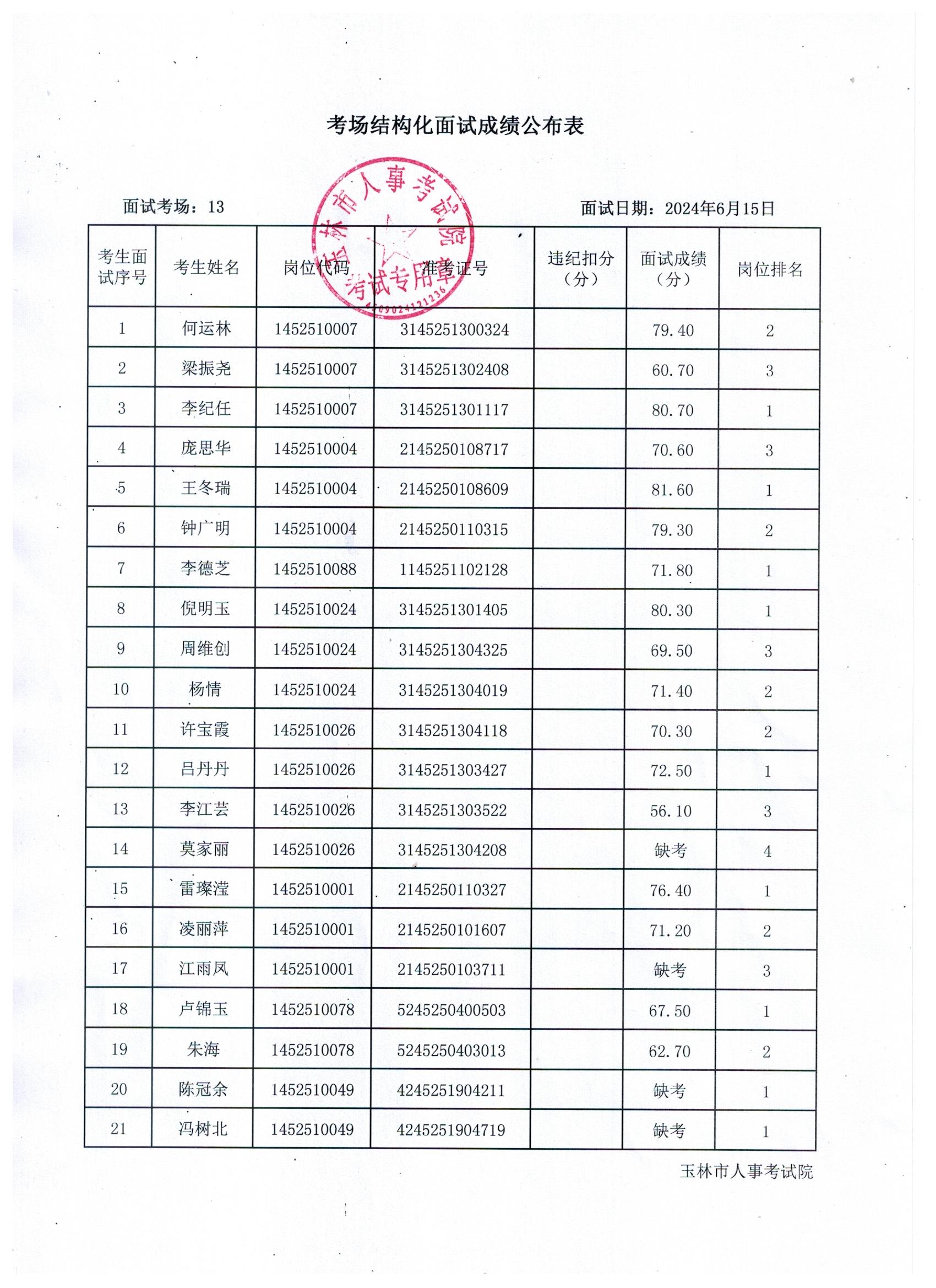 原文標(biāo)題:2024年玉林市直(含玉州區(qū)、福綿區(qū)、玉東新區(qū))事業(yè)單位公開招聘人員面試成績公布(6月15日)