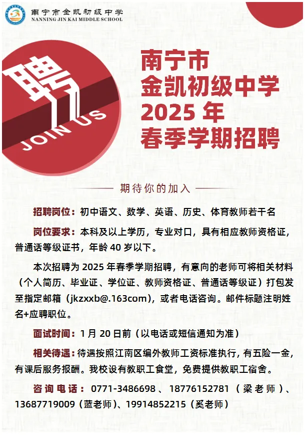 2025年春季南寧市金凱初級(jí)中學(xué)招聘