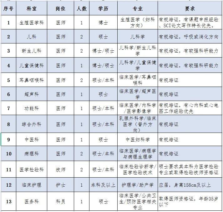 根據(jù)醫(yī)院整體發(fā)展規(guī)劃和學(xué)科建設(shè)需要,柳州市婦幼保健院面向社會(huì)公開招聘各學(xué)科相關(guān)專業(yè)技術(shù)人才,具體如下: