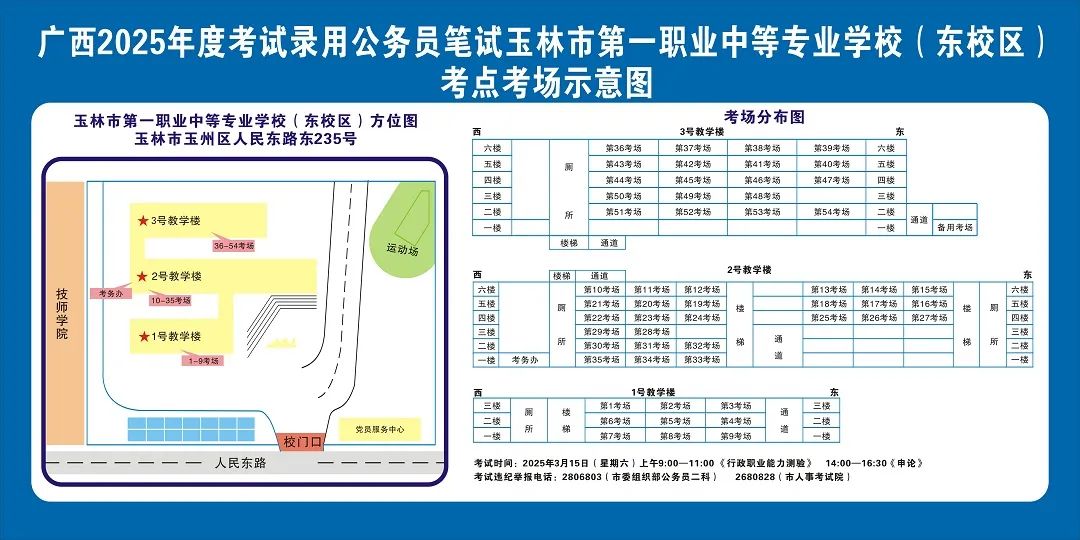 請?zhí)崆傲私獗救怂诳键c(diǎn)具體位置,熟悉考點(diǎn)周邊情況,特別是考點(diǎn)周邊的食宿、交通情況,合理做好食宿安排和出行計(jì)劃。需要特別注意的是:玉林市第一職業(yè)中等專業(yè)學(xué)??键c(diǎn)是設(shè)在該校的東校區(qū)(人民東路東235號);玉林市第一中學(xué)考點(diǎn)是設(shè)在該校的運(yùn)嶺路校區(qū)(二環(huán)北路1228號)!