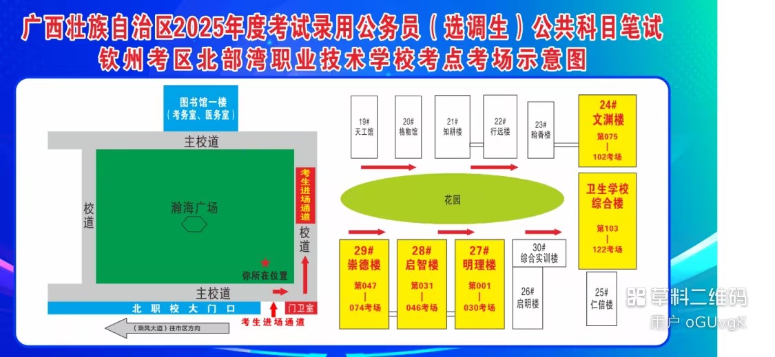 欽州考區(qū)共設(shè)兩個(gè)考點(diǎn),分別為北部灣大學(xué)考點(diǎn)、北部灣職業(yè)技術(shù)學(xué)??键c(diǎn)。(考點(diǎn)地址和具體考場安排請掃附后的二維碼查看)