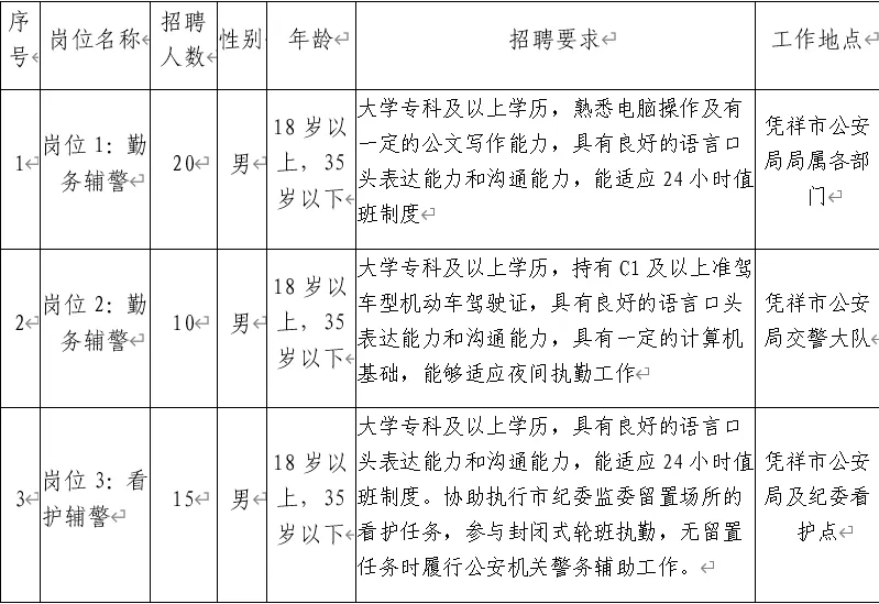 為適應(yīng)憑祥市公安機(jī)關(guān)管理工作發(fā)展需要,憑祥市公安局決定面向社會公開招聘40名警務(wù)輔助人員(以下簡稱輔警)。具體事宜如下: