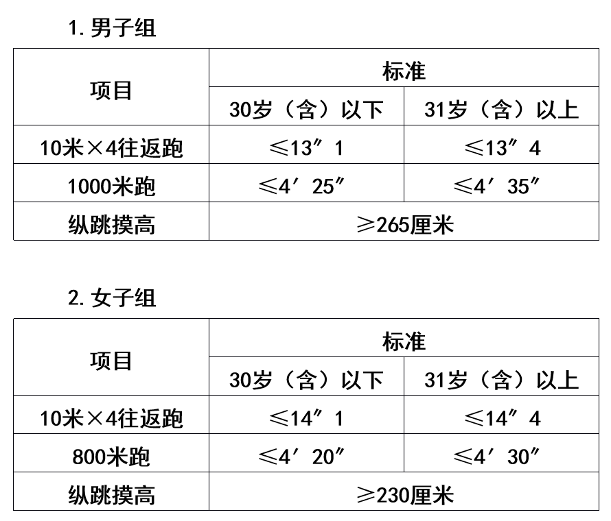 體能測評的項目和標(biāo)準(zhǔn)按照《關(guān)于印發(fā)〈公安機關(guān)錄用人民警察體能測評項目和標(biāo)準(zhǔn)〉的通知》(公政治〔2024〕60號)執(zhí)行,其中綜合管理類、執(zhí)法勤務(wù)類職位測查全部3個項目,警務(wù)技術(shù)類職位免予測查1000米(男)/800米(女)跑項目。對于專業(yè)人才緊缺難以形成競爭的特殊職位(緊缺職位),體能測評三項中有兩項達標(biāo)的,視為合格。凡應(yīng)測項目中任意一項不達標(biāo)的,即為體能測評不合格。具體如下: