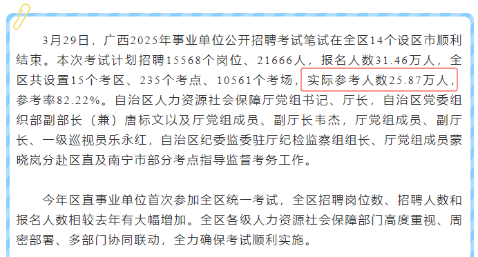 今年廣西事編統(tǒng)考報(bào)名人數(shù)31.46萬(wàn)人,25.87萬(wàn)人參考,參考率82.22%