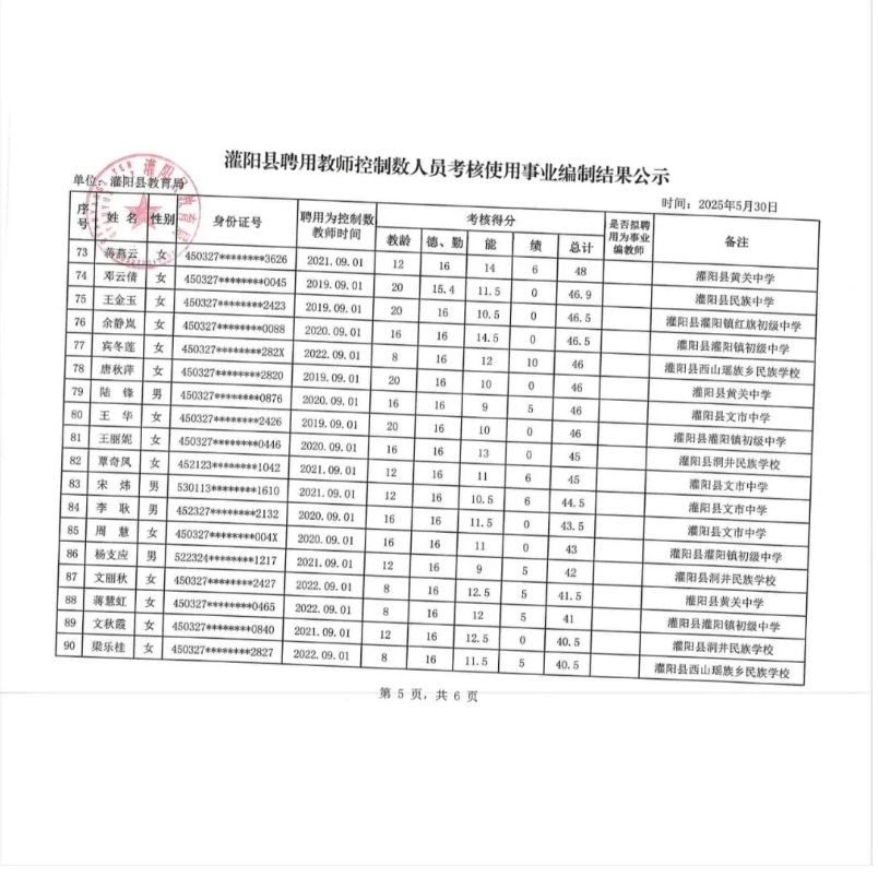 灌陽(yáng)縣聘用教師控制數(shù)人員考核使用事業(yè)編制結(jié)果公示