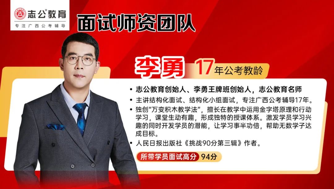 李勇——志公教育創(chuàng)始人、李勇王牌®班創(chuàng)始人,志公教育名師。主講結(jié)構(gòu)化面試、結(jié)構(gòu)化小組面試,專注廣西公考輔導(dǎo)17年。獨(dú)創(chuàng)“萬變積木教學(xué)法”,擅長(zhǎng)在教學(xué)中運(yùn)用金字塔原理和行動(dòng)學(xué)習(xí),課堂生動(dòng)有趣,形成獨(dú)特的授課體系。激發(fā)學(xué)員學(xué)習(xí)興趣的同時(shí)開發(fā)學(xué)員的潛能,讓學(xué)習(xí)事半功倍,幫助無數(shù)學(xué)子達(dá)成目標(biāo)。同時(shí)也是人民日?qǐng)?bào)出版社《挑戰(zhàn)90分第三輯》作者。
