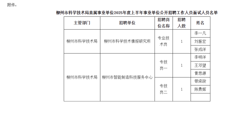 附件:柳州市科學技術局直屬事業(yè)單位2025年度上半年事業(yè)單位公開招聘工作人員面試人員名單
