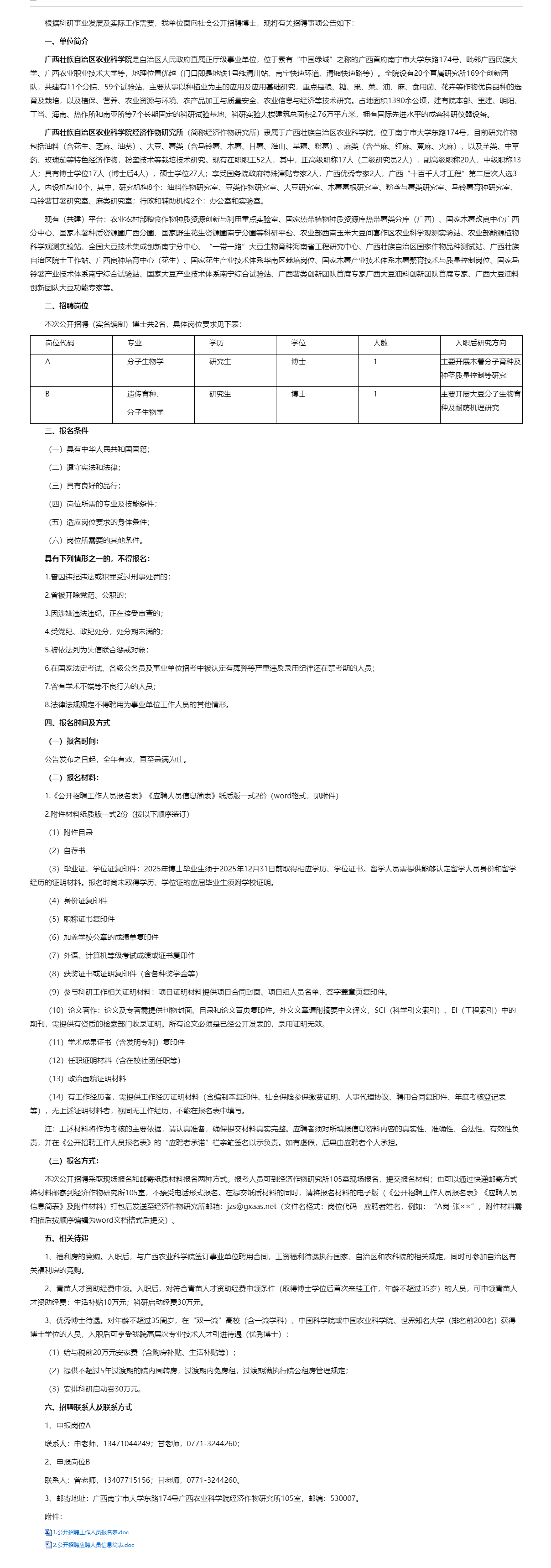 原文標(biāo)題:廣西農(nóng)業(yè)科學(xué)院經(jīng)濟(jì)作物研究所2025年博士公開招聘公告