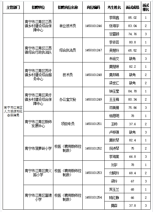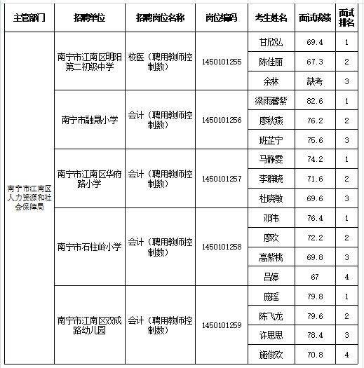 南寧市江南區(qū)人力資源和社會保障局2025年公開考試招聘事業(yè)單位工作人員面試成績表
