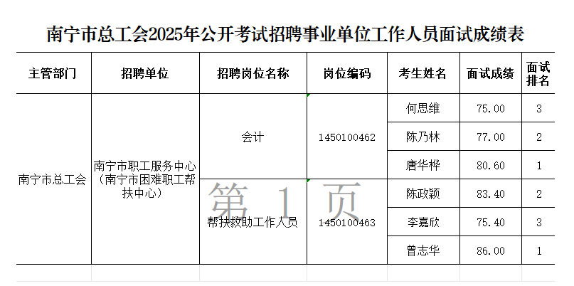 原文標(biāo)題:南寧市總工會2025年公開考試招聘事業(yè)單位工作人員面試成績表
