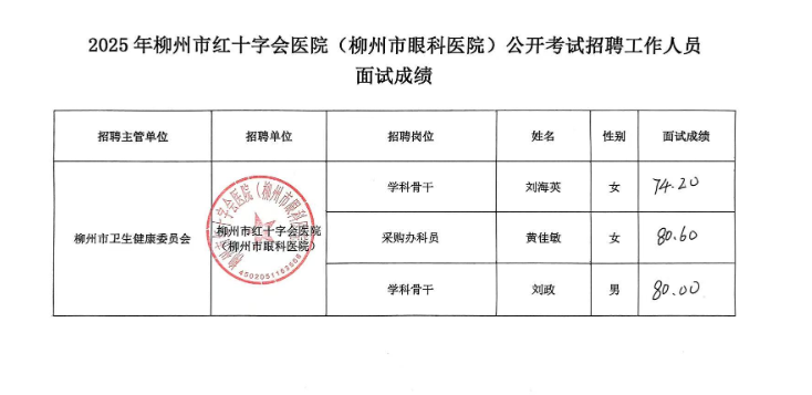2025年度柳州市紅十字會醫(yī)院(柳州市眼科醫(yī)院)公開招聘中高級(急需緊缺)人才(第二批)面試成績公示