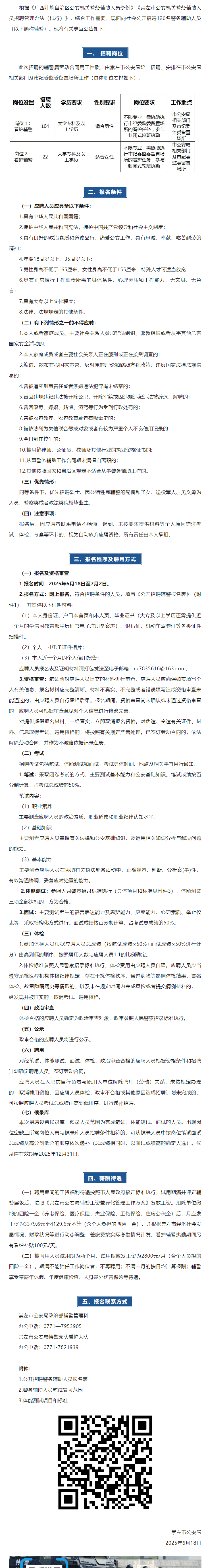 2025年崇左市公安局警務輔助人員招聘126人
