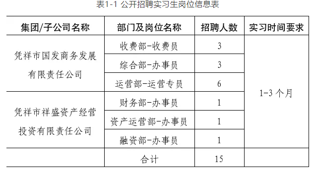 本次共計(jì)劃招聘憑祥市國際貿(mào)易開發(fā)集團(tuán)有限公司下屬企業(yè)實(shí)習(xí)生崗位15人。具體要求詳見《附件1:憑祥市國際貿(mào)易開發(fā)集團(tuán)有限公司2025年公開招聘暑期實(shí)習(xí)生崗位信息表》