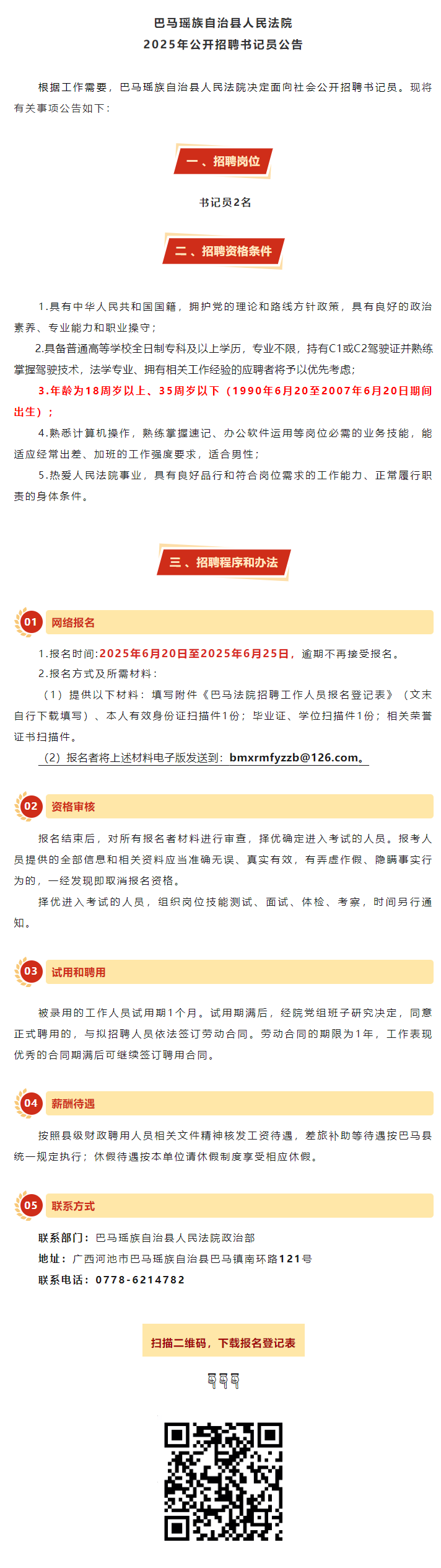 原文標題:巴馬瑤族自治縣人民法院關(guān)于公開招聘書記員公告