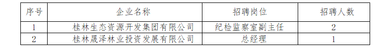 根據(jù)桂林生態(tài)資源開發(fā)集團(tuán)有限公司經(jīng)營管理和發(fā)展需要,現(xiàn)面向社會公開招聘集團(tuán)本部及下轄子公司2個崗位人員,有關(guān)事項公告如下: