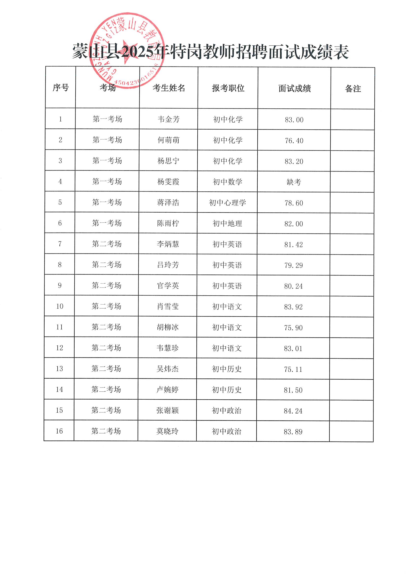 原文標(biāo)題:蒙山縣2025年特崗教師招聘面試成績公告