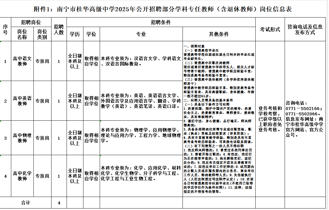 附件1:《南寧市桂華高級(jí)中學(xué)公開招聘專任教師(含退休教師)崗位信息表》