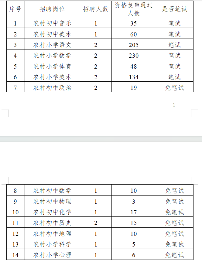 根據(jù)《桂林市雁山區(qū)2025年特崗教師招聘公告》要求“筆試按實際通過資格復審人數(shù)開考;招聘崗位資格復審通過人數(shù)不足20人免筆試,資格復審通過人數(shù)20人以上(含20人,研究生及以上學歷不包含在內,研究生及以上學歷免筆試),需進行筆試。”經現(xiàn)場資格復審,桂林市雁山區(qū)2025年特崗教師招聘筆試、免筆試學科崗位情況如下: