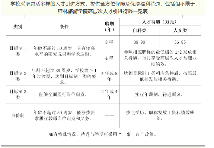 4.根據(jù)自治區(qū)政府文件要求,符合相應條件者,學校積極配合申請廣西壯族自治區(qū)高層次人才認定和各類人才項目,若入選可享受各類優(yōu)厚的人才待遇,詳情請登錄廣西高層次人才“一站式”服務平臺(http://www.gxrc.org/)查閱。首次來桂工作的35歲以下、具有博士學位的青年人才,可按照政策申領自治區(qū)青苗人才普惠性支持。如入選桂林市高層次人才,還可以享受桂林市高層次人才有關津貼、購房補貼和個稅獎勵等人才補助。詳見桂林市高層次人才一站式服務平臺(https://gcc.glrcw.com/)。