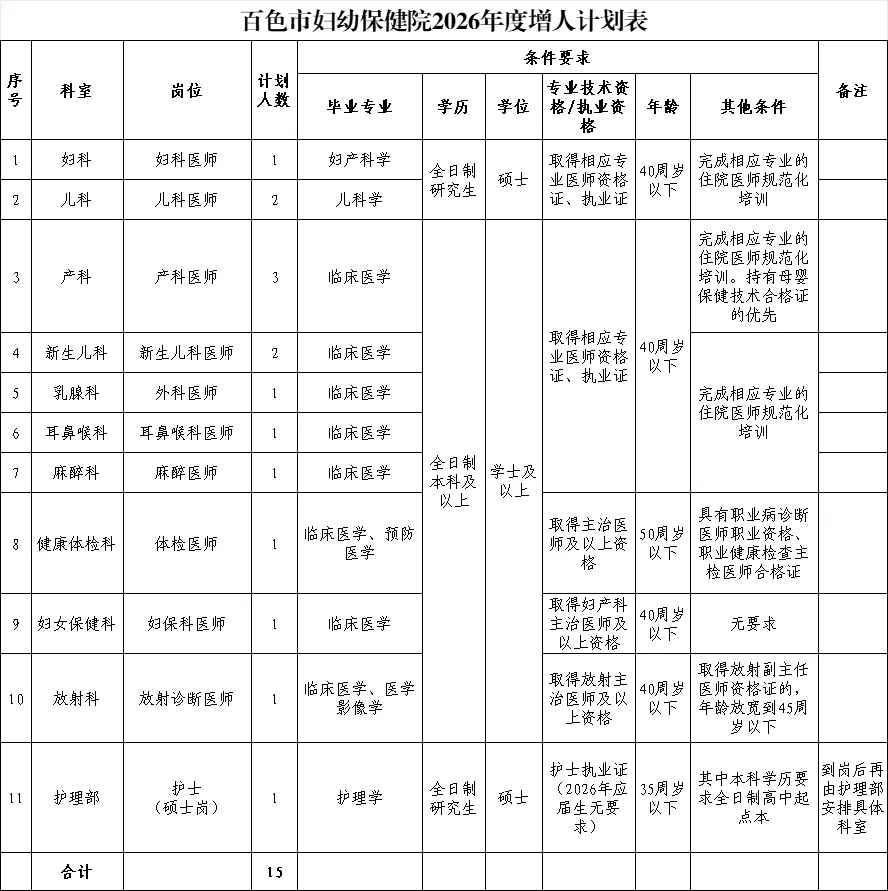 咨詢電話:百色市婦幼保健院人事科0776-2842398