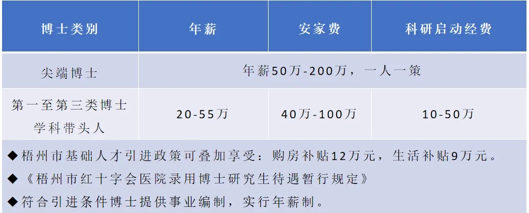 博士研究生學歷學位的急需緊缺專業(yè)人才:享受醫(yī)院引進博士待遇20-200萬元/年,實行年薪制待遇一人一議,提供科研啟動經費10萬-50萬元,疊加享受梧州市人才引進補助,安家費52-125萬元,生活補貼9-12萬元。