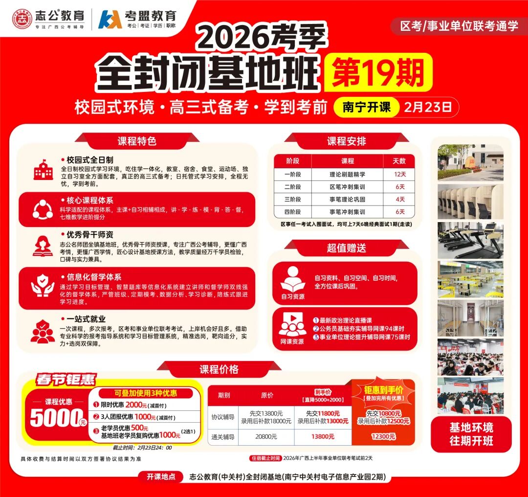 ?校園式環(huán)境,隔絕外界干擾:志公教育(中關(guān)村)2026考季全封閉基地班19期打造全日制校園式學(xué)習(xí)環(huán)境,高三嚴(yán)管式備考,一直可以學(xué)到考前。如果你自律性較差,需要一個(gè)好的學(xué)習(xí)氛圍和環(huán)境;如果你想要更快速上/岸,那你需要一個(gè)科學(xué)的學(xué)習(xí)體系,如果你想要考更好的職位,那你需要個(gè)性化和有效的提分方案,那么恭喜你,已經(jīng)找到了解決方法,請來志公教育全封閉基地班!