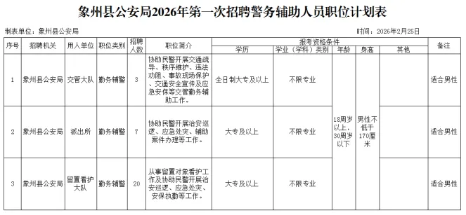 (一)招聘人數(shù):30人,詳見《象州縣公安局2026年第一次公開招聘警務輔助人員職位計劃表》(附件1)