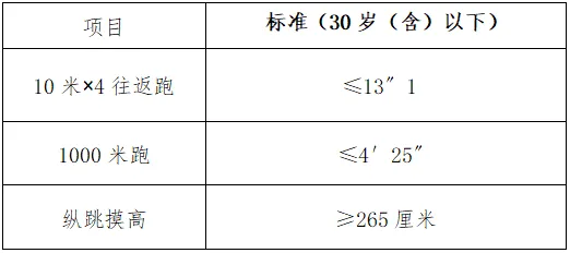 參加體能測評的人員為筆試考試成績合格的考生。體能測評的標準,參照《公安機關(guān)錄用人民警察體能測評項目和標準》的標準,具體如下: