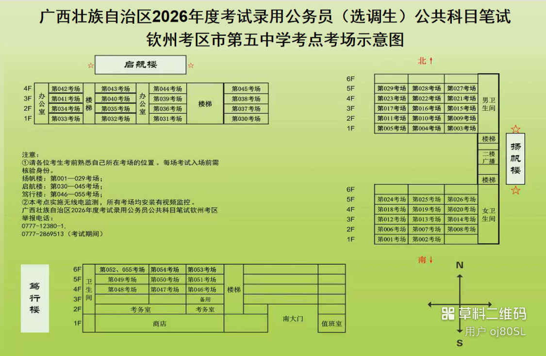 欽州考區(qū)共設三個考點,分別為北部灣大學考點、北部灣職業(yè)技術學校考點、欽州市第五中學考點。(考點地址和具體考場安排請掃附后的二維碼查看)