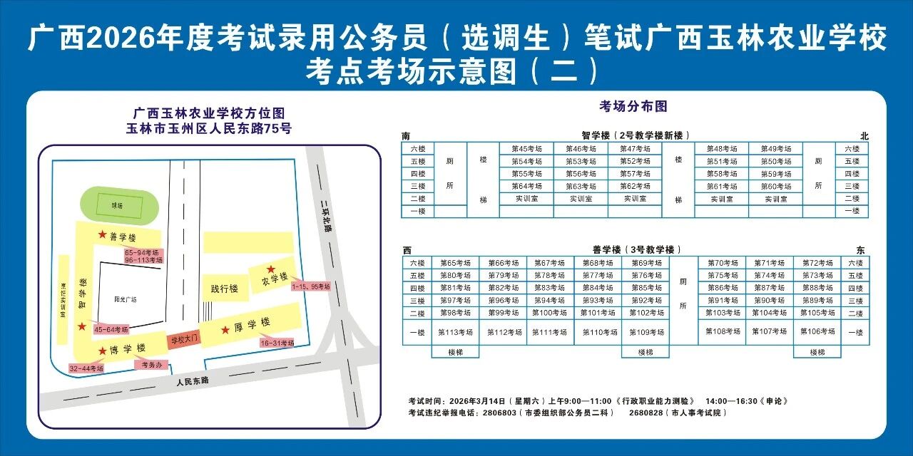 廣西2026年度考試錄用公務(wù)員(選調(diào)生)筆試將于3月14日舉行,為進一步提升玉林考區(qū)服務(wù)保障質(zhì)量,現(xiàn)就有關(guān)注意事項提示如下,請廣大考生做好應(yīng)試準備工作,準確掌握考試時間、考點地址及相關(guān)注意事項。